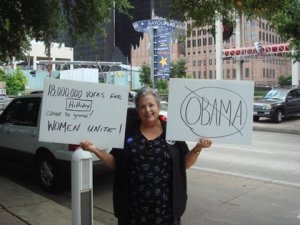 Unfortunately, all assembled guests (this one outside) were not equally happy to support Senator Obama. Lanell Anderson feels “disenfranchised and cheated” by the media, the Demoratic Party and Obama supporters. She’s an angry Hillary Clinton supporter and says Senator Clinton was “forced” to make her concession speech.