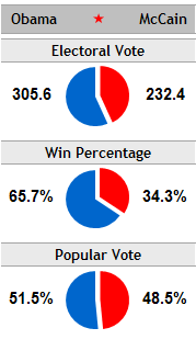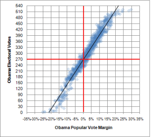 The relationship between the popular vote and the electoral vote is approximately linear, except at the endpoints. As a rule of thumb, a gain of one percentage point in a Obama’s popular vote share results in a gain of 25 electoral votes. This is also, you will note, a pretty steep slope. If Obama wins the election by 4 percentage points, he projects to win by approximately 100 electoral votes (319-219).