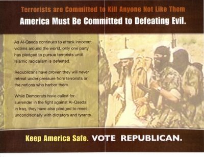 “Terrorists are Committed to Kill Anyone Not Like Them. America Must be Committed to Defeating Evil. As AL-Qaeda continues to attack innocent victims around the world, only one party has pledged to pursue terrorists until Islamic radicalism is defeated. Republicans have proven they will never retreat under pressure from terrorists or the nations who harbor them. While Democrats have called for surrender in the fight against Al-Qaeda in Iraq, they have also pledged to meet unconditionally with dictators and tyrants. Keep America safe. Vote Republican.” – From a Florida voter mailer endorsed by Gov. Charlie “Closet Case” Crist.