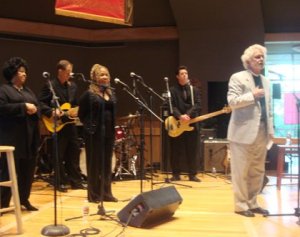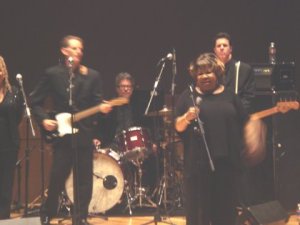 Father Bill introducing the band, Yvonne Staples far left