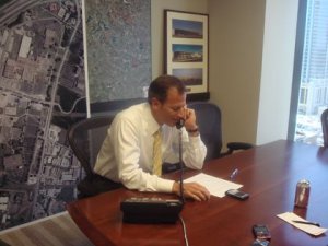 (Community Matters) Kirk Rudy and I gathered in one of his conference rooms today for an NFC call with President Obama. Gov Kaine (DNC Chair) spoke just before the President, explaining DNC priorities 1) working for presidential success, 2) state party strength and 3) grassroots politics. Then, we hear an Air Force One operator interrupt, Reggie Love gets on the line asking us to hold, then President Obama.