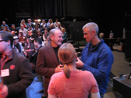 Yesterday’s speakers and entertainment included: Rip Esselstyn Firefighter, Author, Nutrition Guru- the hunk, triathelte/fireman taunting us w/ a perfect physique and promises of longevity by living plant strong- the Engine 2 Diet.   Doug Ulman President/CEO the Lance Armstrong Foundation. Founder of the Ulman Foundation for Young Adults  – (what’s with all the hunks at TEDxAustin?) – my good friend who says out loud “cancer sucks,” stands as an example that it attacks athletes as well as writers as well as those living unhealthy life styles, celebrates the life livestrong gives us, notes the irony of how a life-threatening disease can be the best thing that ever happened to someone, and challenges the term “non-profit.” Steven Tomlinson Business educator & coach, theatre artist, co-founder of Acton School of Business – – an enthusiastically received presentation – integrate what you love doing and don’t discard anything. Christopher E. Mueller Ph.D. Scientist, Life Technologies Inc – engaging our imaginations on the practicality of genomic content deciphering.  Chris Shipley Chairman and CEO, Guidewire Group, Inc. – umm, the importance of small business to America’s economy (the only full scale tilt of the day in part b/c we could tell she’s so smart and we wanted real insights)Suzanne + David Armistead Parents, Artists, Producers; Rev. Janet Maykus Principal/College of Pastoral Leaders – *listen,* and happiness is dependent on friends (so proud.  great presentation. felt like watching my little sister on stage); Dr. William Merrell Professor, Texas A&M Galveston – spoke about the Ike dyke – it would be surprisingly affordable, appears doable and we’ll regret we didn’t – just watch; Mark RolstonChief Creative Officer, frog design – like a brilliant surfer dude who rolls his own, lies back and visualizes computers seamlessly integrating into our lives; John Pointer Musician, Actor, Cultural Entrepreneur – awesome; Carrie Conte, Ph.D. Prenatal + Perinatal Psychologist – – little bodies, big persons – babies as fully baked; Turk + Christy Pipkin Founders of The Nobelity Project. Author & Filmmaker. Producer – doing so much more than making movies – saving & making lives ; Robert Hunt– the unsung Wright brother; Richard Garriott Astronaut, Entrepreneur, Space Visionary – the dude doesn’t just make video games, he lives a video game and is making one come to life in outer space; John Phillip Santos Filmmaker, Journalist, Author – an award-winning humanist brings it back to real and the ancestral; Ruby Jane, fiddler, songwriter, and singer; Philip Berber Founder, (with his wife, Donna) The Glimmer of Hope Foundation – isn’t hard to see why he and Donna were named the 6th most impactful philanthropists in the world; Mark McKinnon Vice Chairman, Public Strategies, Inc. – it’s hard to reconcile his credentials with his responsibility for electing GWB, but I love his love for his wife, Ann. their bios here