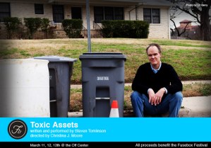 Toxic Assets has been going great – two shows performed, one to go. Tonight’s an especially super evening since includes FuseBox Festival’s top supporters – financial & artistic – as well as many family & friends. Good gosh, who’s been to see the show already includes – Andrea Ariel, Amanda Chiampi, Joyce Christian & Rudy Green, Scott Collier & Kala Philo, Linda Fields, Jo & Jon Ivester, Janet, Mark, Ben, Lena