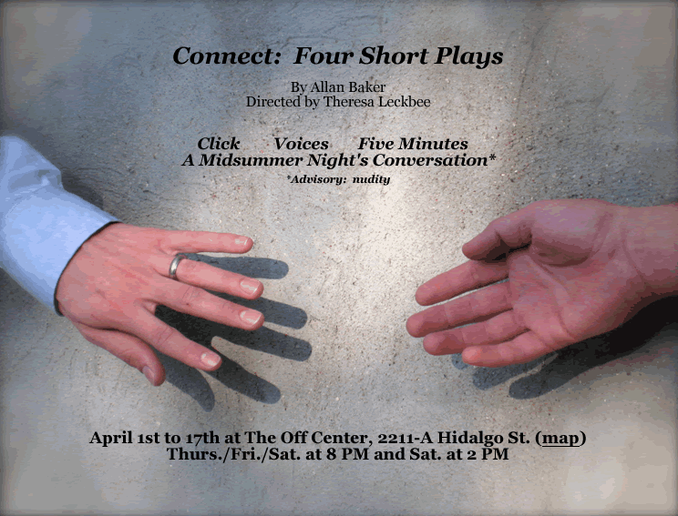 Allan’s a 20-year friend, a long time LGBT activist & leader and a playwright since 2004. His short pieces have been recognized by Frontera Fest and the Emerging Artists Theatre’s Fall Festival of Short Plays in NYC. Connect runs through April 17 at the Rude Mechs’ Off Center and should be seen.