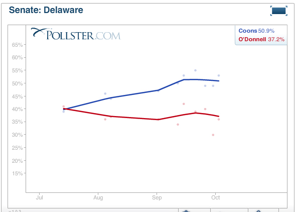 HuffPost Pollster’s analysis of the race shows O’Donnell trailing Democrat Chris Coons by double digit margins.