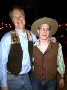 Lots of Austin’s arts scene in the audience – UT Fine Arts Dean Doug Dempster, Theater & Dance Chair Brant Pope, Suzan Zeder, playwrights Allison Gregory & Stephen Dietz, Jean Clair Van Ryzin & Aldo Valdes, Sarah Richardson (in from NY), Mark Holzbach, Rino Pizzi, Dorsey Barger and lots others. There’s a fun western carnival during intermission, and even the opportunity to borrow western wear (which as you see in the picture, Steven and Brent did).