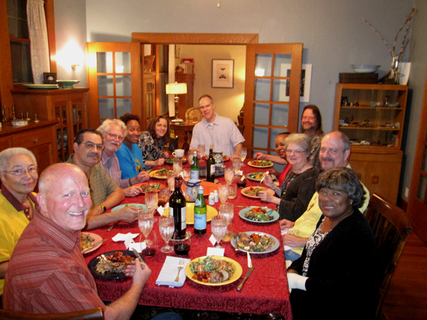 (Community Matters) and twice over one weekend. Amy Donohue-Adams & Bill (Wm Seth) Adams are two of our dearest, closest friends. Unfortunately, when they both finally retired, they decided Wigbey Island would be their home – Bill taught at the Episcopal Theological Seminary of the Southwest and Amy was the director of chaplin care at St David’s Round Rock. Friday evening I made bouillabaisse for a late dinner just the four of us; last night, Meg (Spoon & Co) whipped up glazed pork loin and roasted chicken for 13 of us.