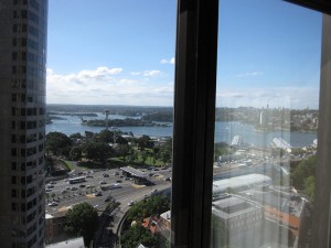 We’ve arrived in Sydney, have two great views from our hotel room, already made the required pilgrimage to their Apple store*, and are seeing Cate Blanchett in Gross & Klein tonight.