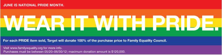 (Community Matters)  Target has agreed to donate up to $120,000 in support of marriage equality by donating proceeds from sale of pride shirts to the Family Equality Council.
