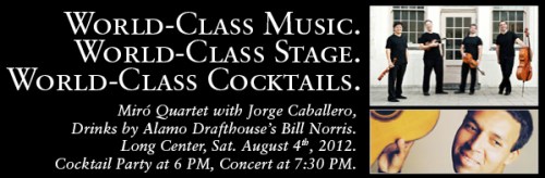 (Community Matters) Matthew Hinsley has created the new IT performing arts organization. I’m not sure what we expected but I had no idea of two things. I had no idea the Austin Classical Guitar Society now commanded audiences the size to fill the Long Center’s Dell Hall, and I had no idea they now commanded the attention of Austin’s most important supporters of musical arts. I knew the evening would be extraordinary – we’ve been to a few of Matthew’s events since becoming friends over 10 years ago, and he only produces exceptional performances. Of course, the Miro Quartet needs no introduction; that Matthew persuaded them to play under ACGS speaks volumes.