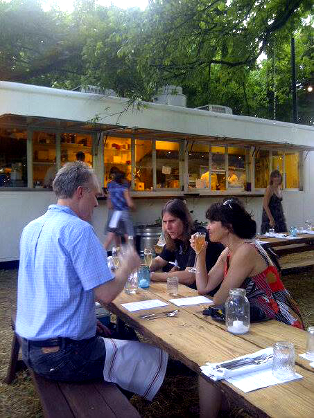 (Community Matters)Dining under the 40 foot Elm, twinkling and dangling lights from the branches, candles on long tables . . . one of my favorite dining experiences this year. Our friend Sonya Cote opened Eden Eastat Springdale Farm. We had dinner there last night with Shawn Sides and Graham Reynolds – admittedly, we could probably have cafeteria food with these two and still have a spectacular night – and the farm to table dining experience was magic.