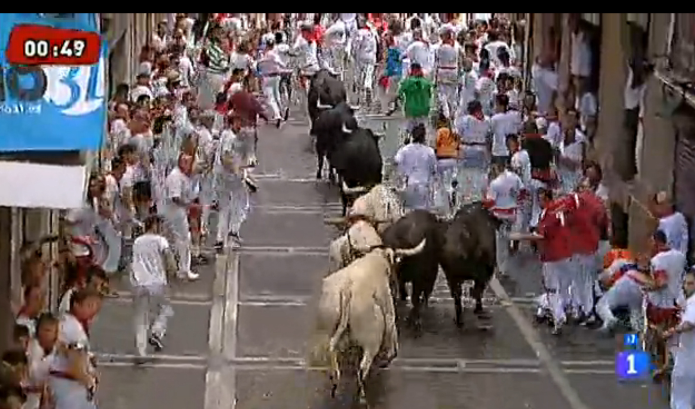(Community Matters) Video from this morning’s Running With The Bulls in Pamplona. Reading that the path into the stadium was unexpectedly blocked – the bulls and people locked together. Was bad; 23 taken to hospital, one evidently in quite serious condition.